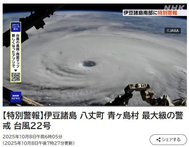 中国新闻网10月8日电 据日本广播公司(NHK)报道,2025年第22号台风“夏柔”将于当地时间9日凌晨逼近日本伊豆群岛。日本气象厅发布了强风大浪特别警报,称每隔几十年可能会发生一次大规模局部灾害。图片来源:NHK报道截图。据日本气象厅称,伊豆群岛有可能发生严重灾害,包括强风造成的建筑物倒塌和巨浪造成的大面积洪水。此外,还可能发生山体滑坡、低洼地区洪水、河流泛滥等次生灾害。请当地居民密切关注疏散信息,撤离至安全地点。