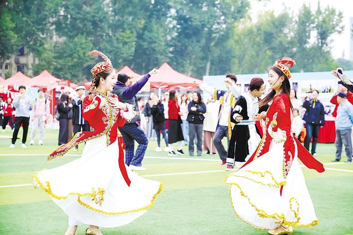 10月25日,“同心筑梦,共筑新征程,共绘中华情”华中科技大学第十二届“石榴红”文化节盛大举行,身着民族服装的学子载歌载舞。 (图片提供:湖北日报全媒体记者何宇欣、通讯员穆尼尔、实习生何树成)